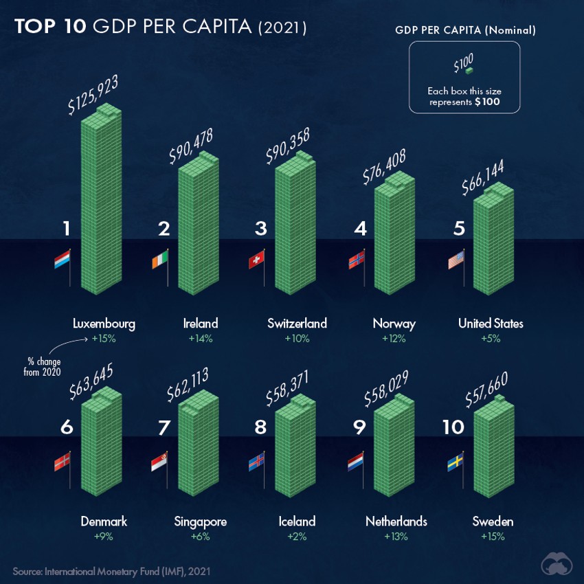 Najveći BDP po glavi stanovnika na planeti ima Luksemburg i on iznosi 125.923 dolara, što je uvećanje od 15 odsto u poslendnjih godinu dana. Na drugom mestu se nalazi Irska sa 90.478 dolara po glavi stanovnika, na trećem Švajcarska sa 90.358 dolara i Norveška sa 76.408 dolara na četvrtom mestu.