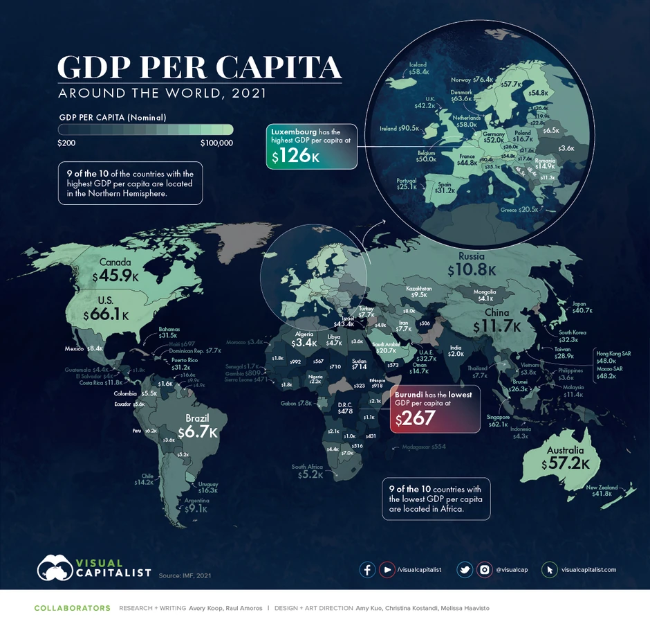 Iako zvanični podaci pokazuju značajno uvećanje životnog standarda stanovnika čitave planete, nejednakost je i dalje izuzetno izražena. Najbogatije zemlje (Luksmeburga) je 471 put bogatija od najsiromašnije (Burundija), piše Visual Capitalist.