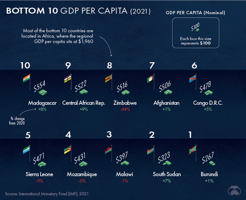 Prema podacima MMF-a najmanji BDP po glavi stanovnika ima burundi sa samo 267 dolara, iz njega je Južni Sudan sa 323 dolara po glavi stanovnika, zatim Malavi sa 397 dolara i Mozambik sa 431 dolara.