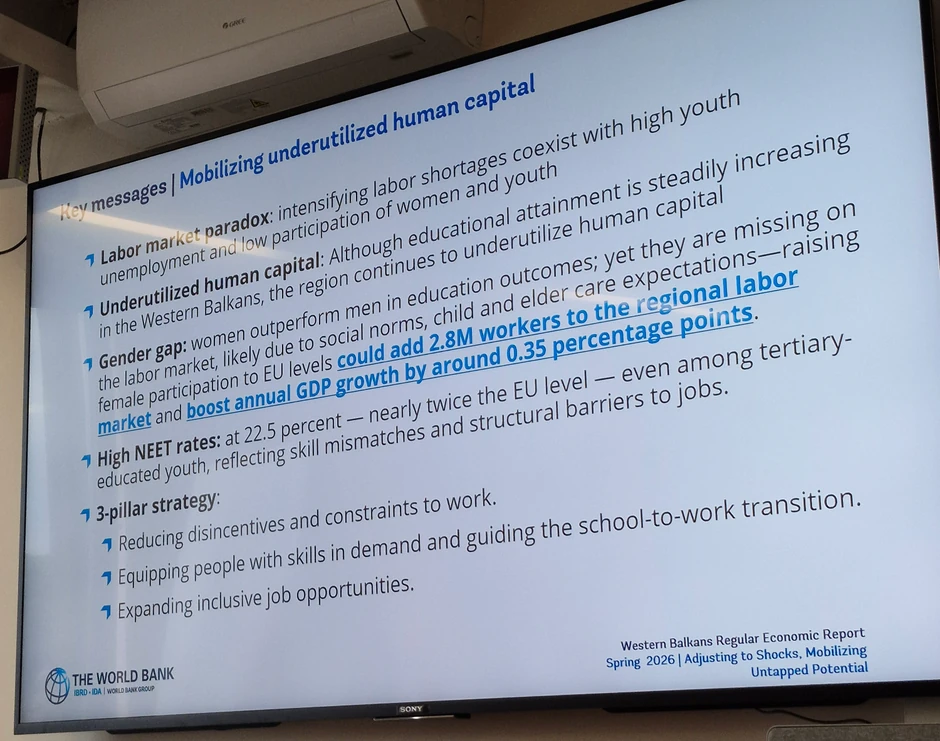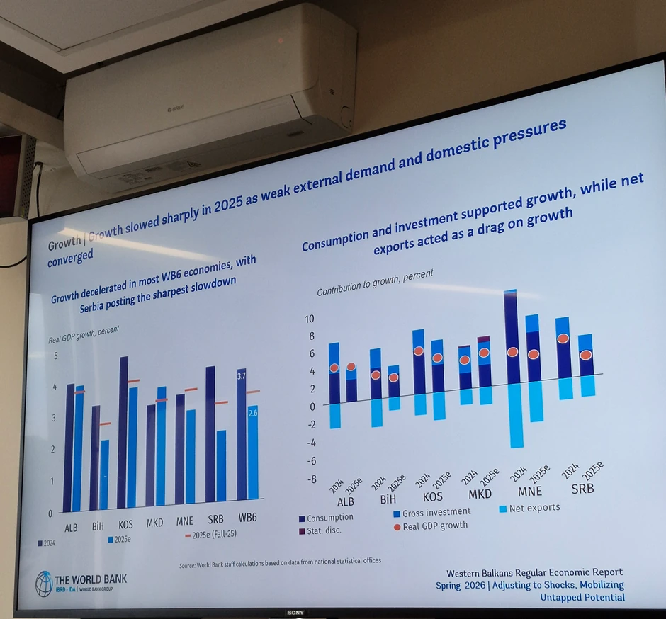 Privredni rast zemalja Zapadnog Balkana ostaće usporen tokom 2026. i 2027. godine, pod uticajem efekata konflikta na Bliskom istoku, uporne inflacije i pojačane neizvesnosti. Da bi se zadržao zamah reformi u zemljama regiona koje se suočavaju sa manjkom radne snage, aktiviranje radne snage biće od ključnog značaja, prema procenama iznetim u danas objavljenom izveštaju Grupe Svetske banke, čemu je prisustvovala i ekipa "Blic Biznisa".