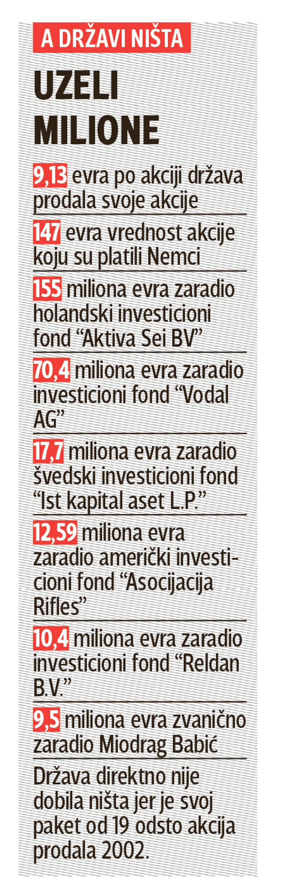 Najveća je ona koja se odnosi na ponašanje države, koja je 2002. godine svoj paket od 19 odsto prodala za samo 9,13 evra po akciji holandskom investicionom fondu "Aktiva Sei BV", koji ih je potom Nemcima preprodao za 147 evra, ali i koje su okolnosti dovele da upravo ovaj fond i menadžment kompanije po privilegovanim cenama dođu do najvećeg broja akcija.
