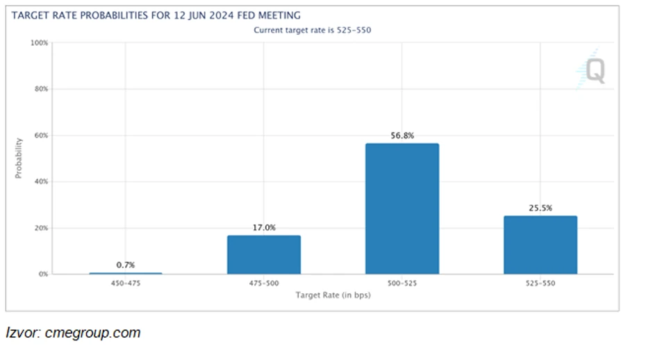 Prvo spuštanje tržište očekuje na sastanku 12. juna, ali i to se može promeniti zavisno od makroekonomskih i privrednih podataka koji diktiraju odluke FED-a. Podsećam da su početkom godine očekivanja bila optimističnija i prvo spuštanje se očekivalo već na martovskom sastanku.