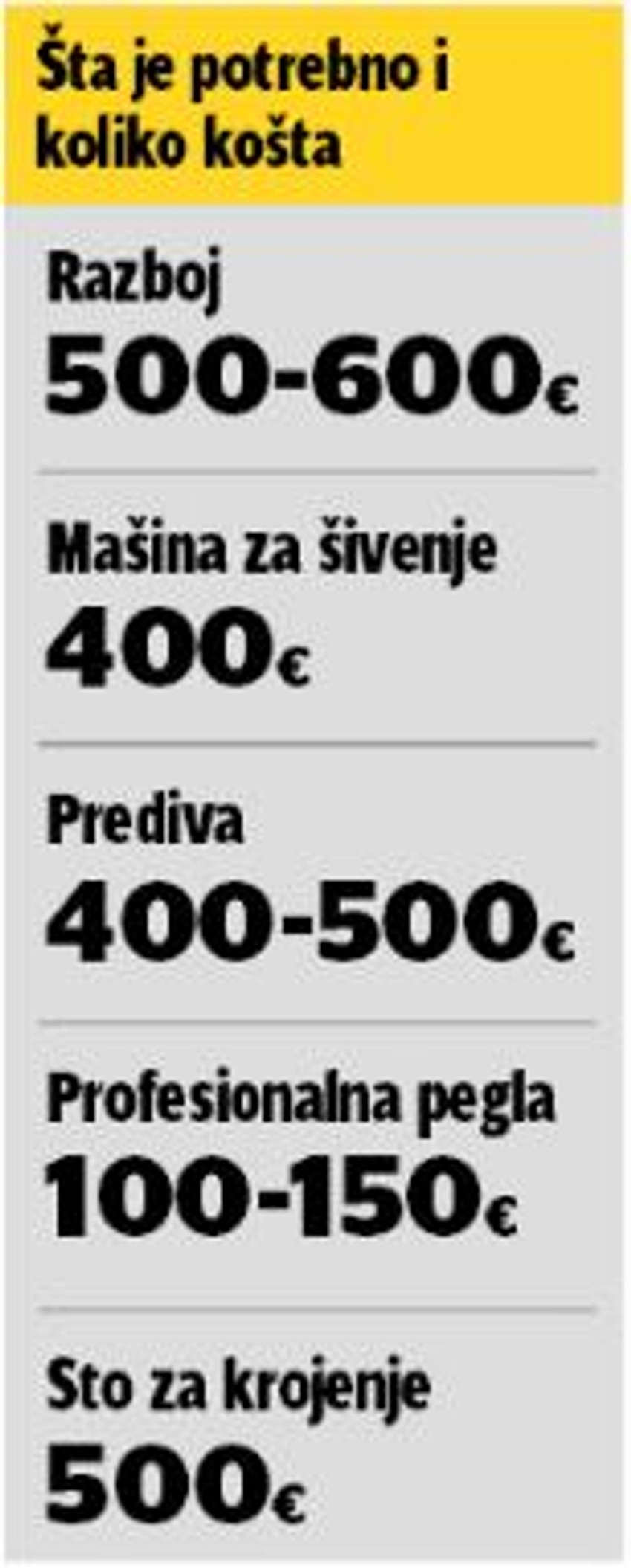 Početno ulaganje podrazumeva nabavku razboja, mašine za šivenje, pegle, stola za krojenje i osnovnih materijala. Za to je potrebno oko dve hiljade evra.