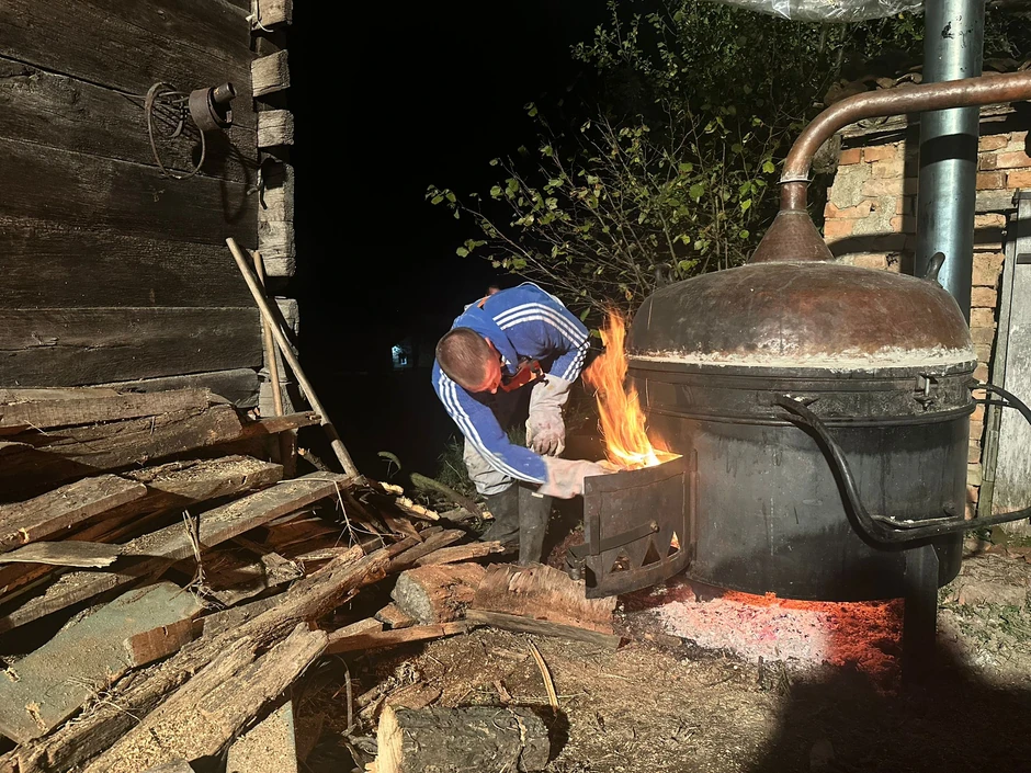 „Iako sam mlad, ne preterujem. Ovo nije moj kazan, pozajmljujem ga od brata, a to se inače naplaćuje kroz ušur. Prošle nedelje sam kod njega pekao rakiju, bilo je deset kazana, sada on meni pomaže. Možda ukupno petnaest kazana ove godine, i to je dovoljno da se tradicija ne zaboravi i da rakija bude dobra“, objašnjava.
