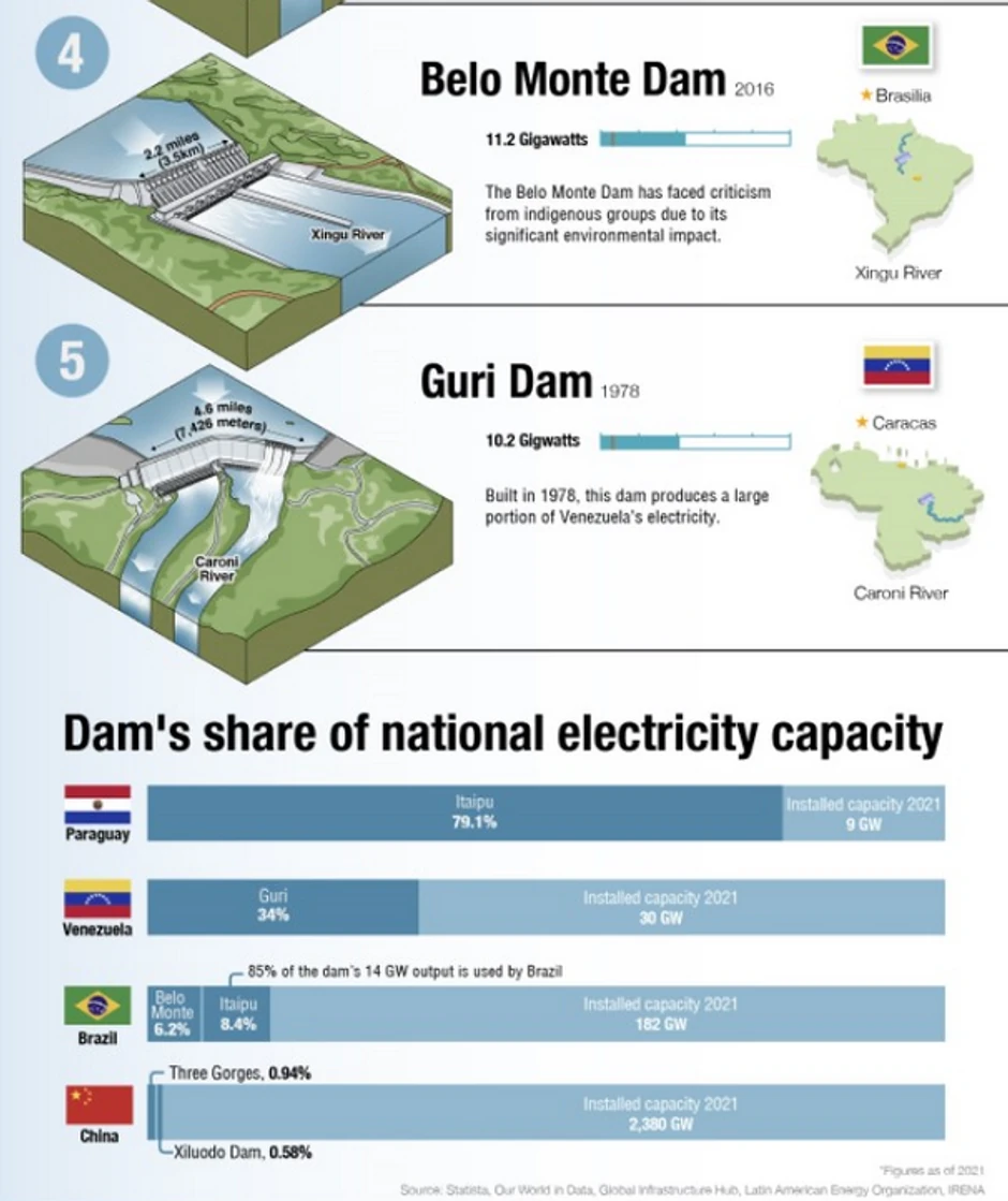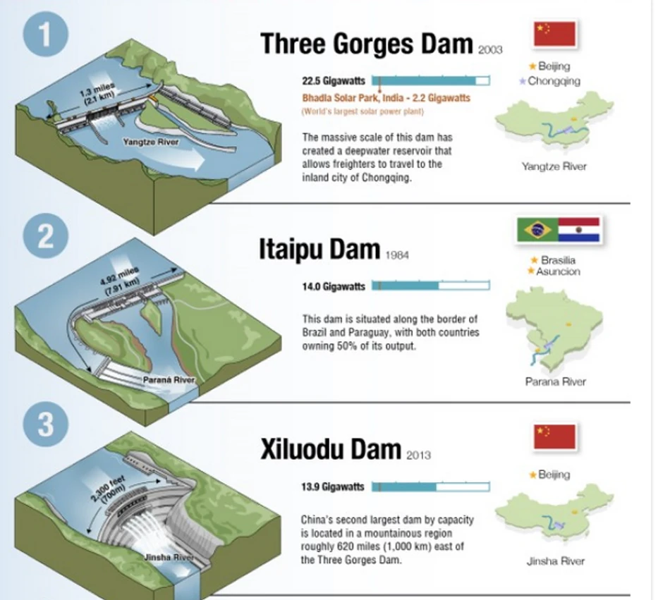 U narednoj infografici prikazano je pet najvećih hidroelektrana na svetu, rangiranih prema njihovoj maksimalnoj snazi i podacima iz 2021. godine. Instalisana snaga je maksimalna količina energije koju postrojenje može da proizvede pod punim opterećenjem.