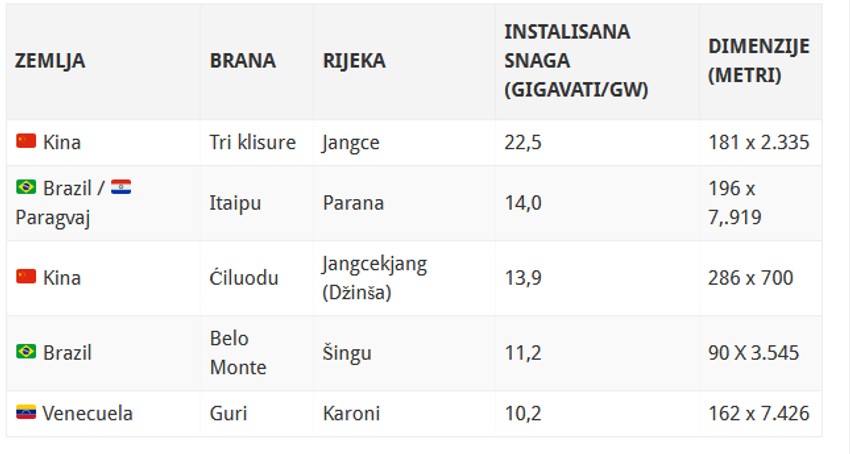Na vrhu liste je kineska brana "Tri klisure", otvorena 2003. godina, koja ima instalisanu snagu od 22,5 gigavata (GW), što je skoro dvostruko više od brane "Itaipu" koja se nalazi na drugom mestu liste. No, kada je reč o godišnjoj proizvodnji, brana "Itaipu" proizvodi približno istu količinu električne energije. To je zato što reka Parana ima malu sezonsku varijaciju, što znači da se brzina protoka vrlo malo menja tokom godine. S druge strane, reka Jangce ima značajan pad protoka nekoliko meseci u godini.