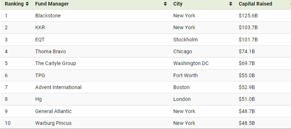 Sledeći na redu su KKR i švedski EQT, od kojih svaki prikupio preko 100 milijardi dolara. U stvari, ovo je bio prvi put da su tri kompanije postigle ovu granicu od 100 milijardi dolara za prikupljanje kapitala na PEI-ovoj rang listi u periodu od pet godina.