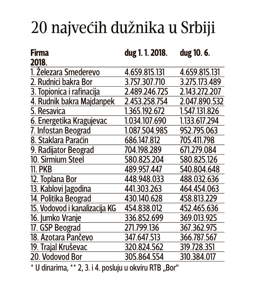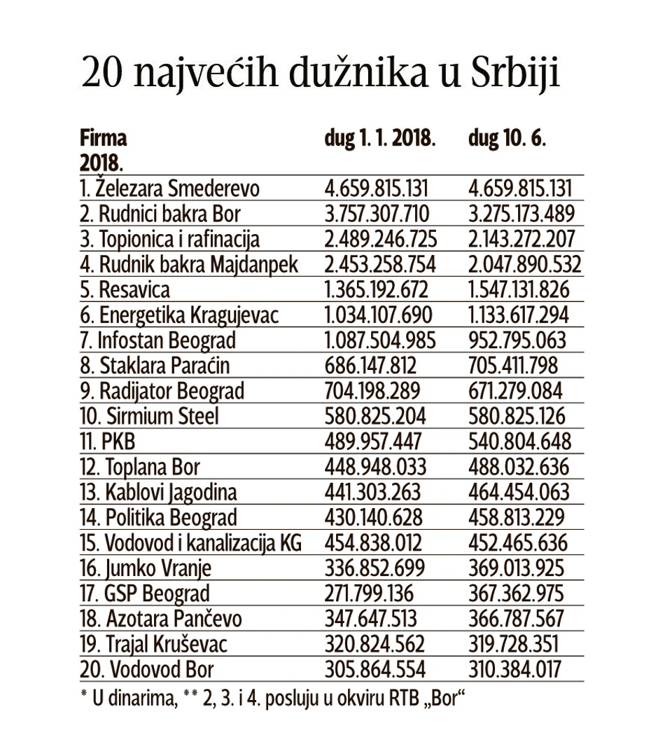 Neslavnom bilansu najviše je doprineo RTB "Bor", koji za svoja tri zavisna preduzeća duguje 7,5 milijardi dinara. Iza njega su Železara Smederevo d.o.o. sa 4,6 milijardi, Rudnik Resavica - 1,5, "Energetika Kragujevac" sa 1,1 milijardu. Slede "Infostan Beograd", "Toplana Bor", PKB, GSP Beograd, Azotara i mnogi drugi, međutim njihov dug je ispod milijardu dinara. Ipak, ono što upada u oči to je da su među 20 najvećih neplatiša, čak pet iz Bora, čiji ukupan dug iznosi 8,3 milijardi. U oči pada i to što nijednoj od ovih kompanija struja nije isključena, dok se građanima to radi za 10.000 dinara.
