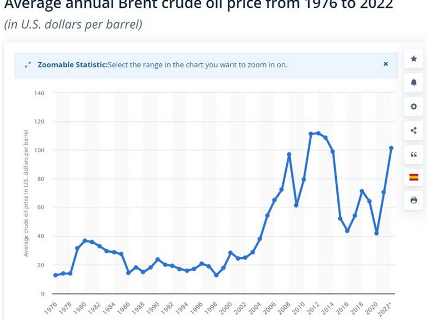 Prateći statističke podatke, prosečna godišnja cena sirove nafte tipa Brent porasla je na 101,37 američkih dolara po barelu od aprila 2022.