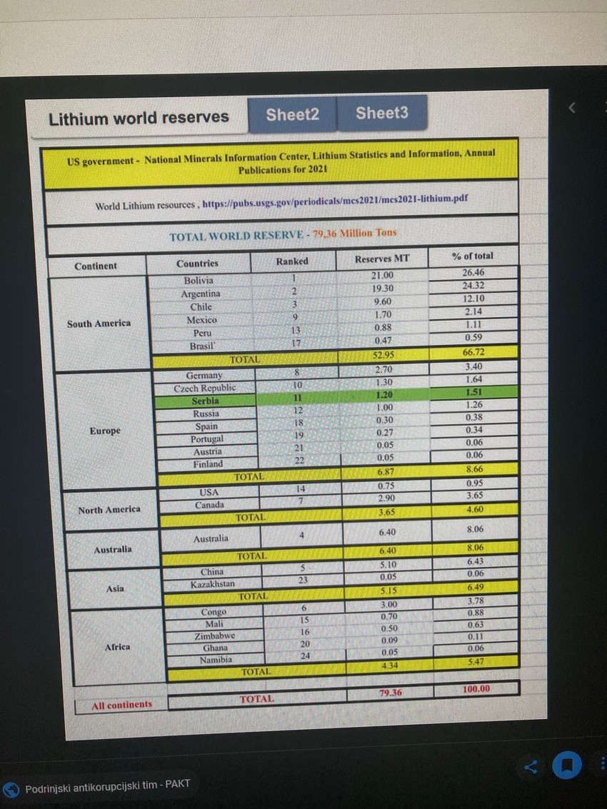 Iz ovih globalnih podataka, koji su obuhvatili 24 države sa svih kontinenata, vidi se da nismo ni rekorderi na tlu Evrope, jer su pre nas sa 2,7 miliona tona rezervi litijuma Nemačka, što je 3,4 odsto svetskih resursa i Češka sa 1,3 miliona tona odnosno 1,3 odsto.
