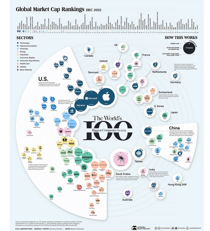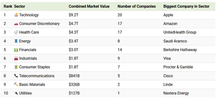 Čak i uz pad tržišnih vrijednosti u celom sektoru u 2022, sektor tehnologije ostaje dominantan. Među najvećim svetskim kompanijama, njih 20 se bavi tehnologijom, a ukupna tržišna vrednost iznosi 9,2 biliona dolara što je oko 31 odsto tržišne vrednosti 100 najvećih kompanija.