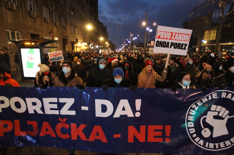 Članovi Udruženja radnika na internetu organizovali su danas protest ispred Doma Narodne skupštine i ponovili zahtev da nadležni obustave naplatu poreza na zarade frilensera retroaktivno za poslednjih pet godina.