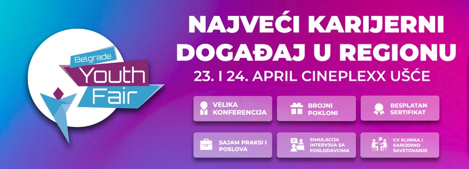 Beogradu će se 23. i 24. aprila održati 12. po redu Belgrade Youth Fair, najveći karijerni događaj za mlade u regionu. Mladi će i ove godine imati priliku da se povežu sa mnogobrojnim poslodavcima i tako sebi obezbede praksu ili zaposlenje, ali i steknu mnoga znanja za koja će dobiti besplatan sertifikat. Program će trajati od 10 do 16 časova, a činiće ga sajamski i konferencijski deo.
