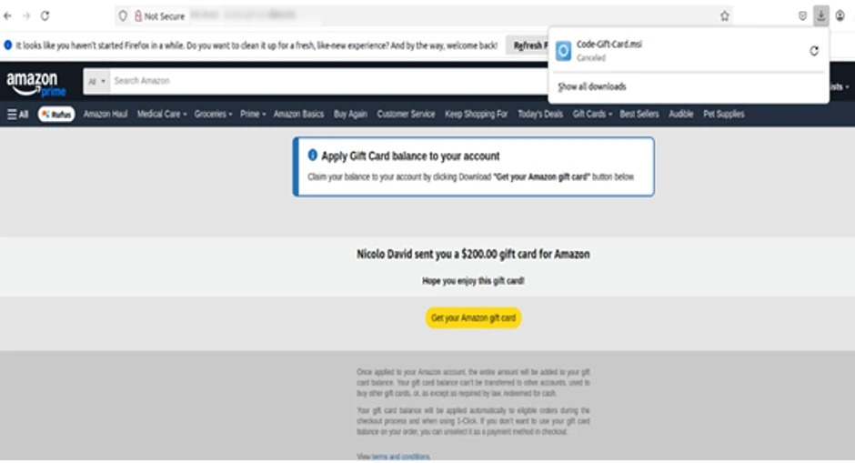 Stručnjaci kompanije Kaspersky otkrili su lažnu internet stranicu koja imitira Amazon, jednu od najpoznatijih onlajn prodavnica, nudeći poklon-karticu u vrednosti od 200 dolara. Ovom primamljivom ponudom prevaranti podstiču korisnike da kliknu na dugme „Preuzmite svoju Amazon poklon-karticu“. Međutim, nakon klika, korisnik preuzima MSI instalacioni fajl sa backdoor zlonamernim softverom koji sajber-kriminalcima omogućava daljinsku kontrolu nad uređajem žrtve.