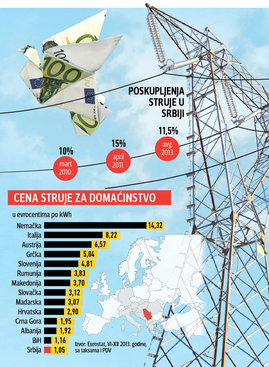 Struja u Srbiji je najjeftinija u regionu, jeftinija za 30 odsto nego u Makedoniji, a 40 posto od Crne Gore i Bosne.