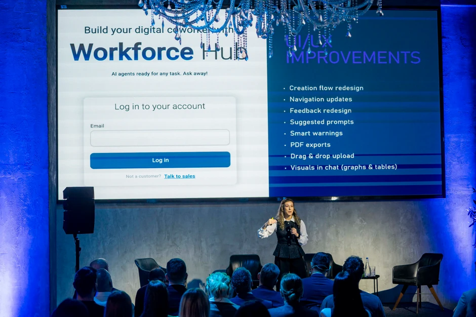 Glavni fokus skupa bili su AI agenti koje razvija Things Solver. Nakon što je prošle godine predstavljena platforma "Workforce Hub", prema rečima Marjanovića, "malo stidljivo i sa strane", tim je u proteklih godinu dana ostvario najbrži razvoj proizvoda do sada. U saradnji sa klijentima i partnerima kreirano je više od 100 agenata, od kojih je 12 već u produkciji i rade aktivno 24 sata dnevno, 7 dana u nedelji.
