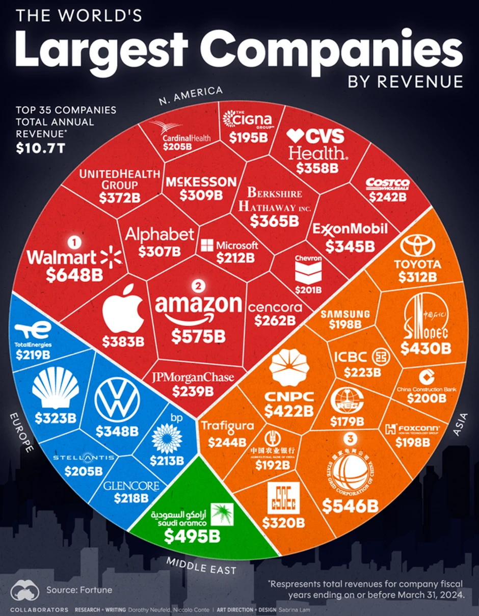 Infografika u prikazuje najveće kompanije po prihodima širom sveta, na osnovu podataka iz Fortune-a.