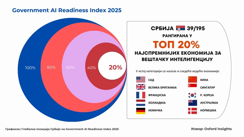 Prema Government AI Readiness Index 2025, koji objavljuje Oxford Insights, Srbija je zauzela 39. mesto od ukupno 195 ocenjenih ekonomija širom sveta, što predstavlja značajan napredak u odnosu na 57. mesto na kojem se nalazila u prošlogodišnjem izveštaju.