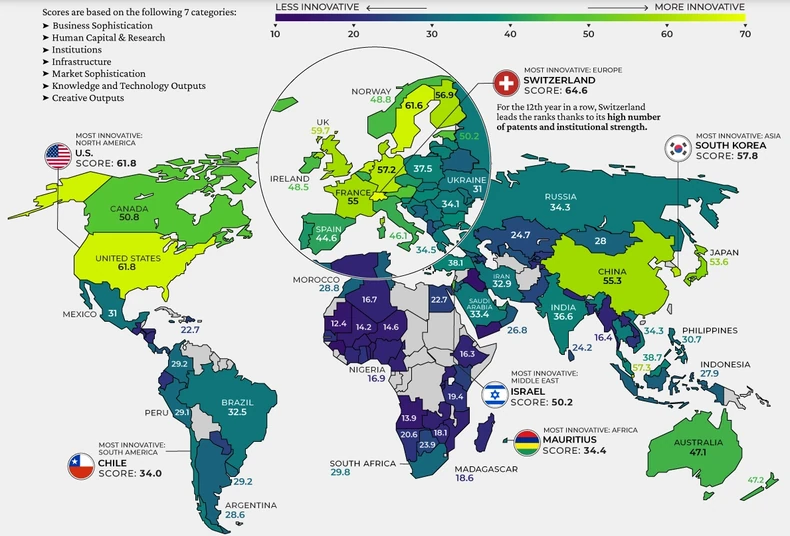 Gornja infografika rangira najinovativnije ekonomije sveta koristeći podatke Globalnog indeksa inovacija VIPO UN-a.