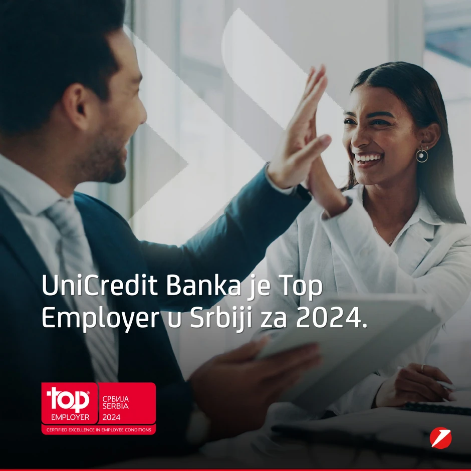 UniCredit Bank je zvanično sertifikovana kao Top Employer (najbolji poslodavac) u Srbiji, zbog svoje kontinuirane posvećenosti konkretnoj dobrobiti zaposlenih, postignutom kroz izvrsnost u politikama i praksi u oblasti ljudskih resursa.