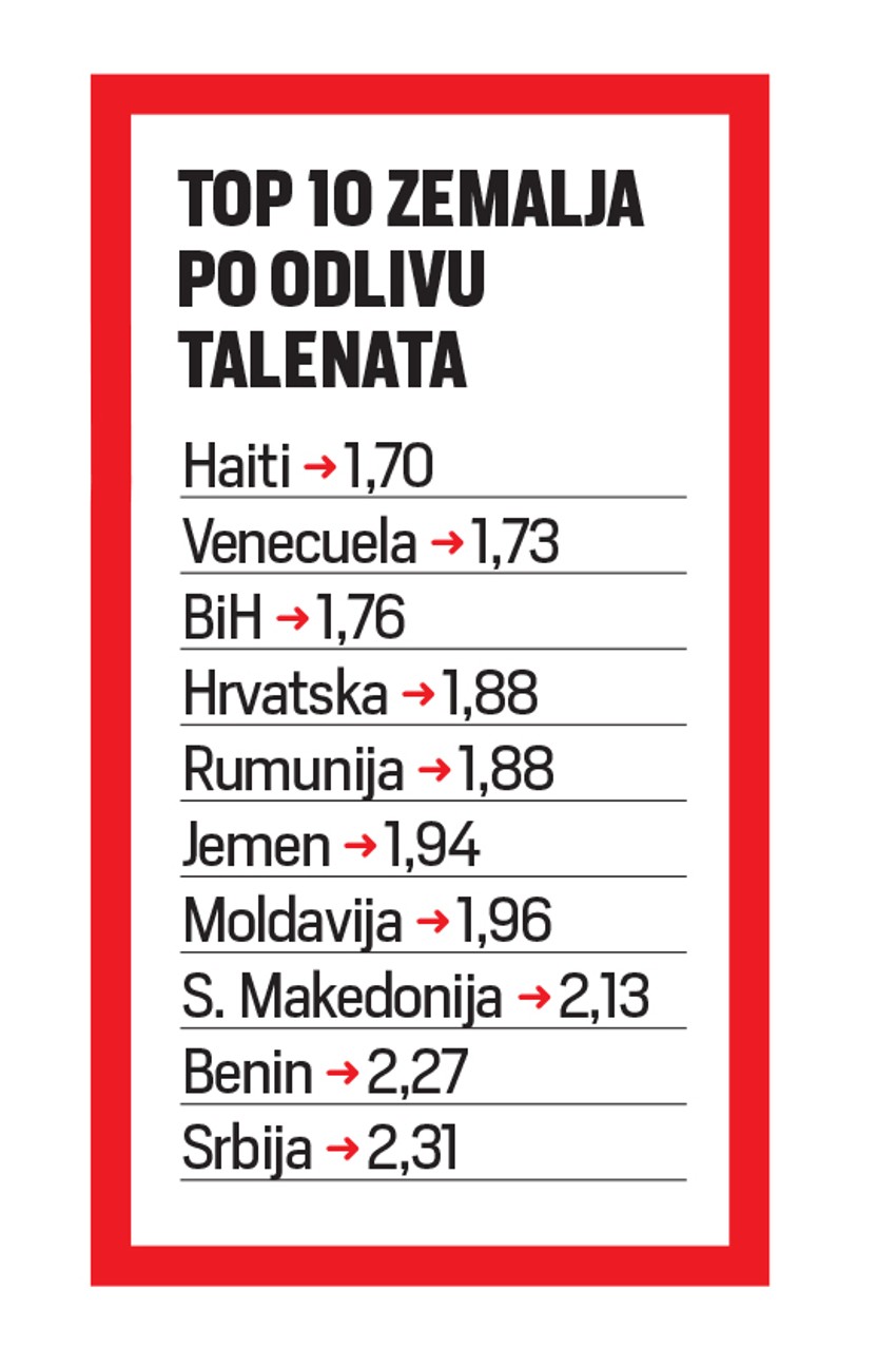 Izveštaj o globalnoj kompetitivnosti za 2018. godinu Svetskog ekonomskog foruma doneo je i rang-listu sa bodovanjem koliko talentovanih ljudi napušta svoje zemlje. Po redosledu koji je objavio britanski list "Ekonomist", prvi je Haiti, a za njim idu Venecuela, Bosna i Hercegovina, Hrvatska, Rumunija, Jemen, Moldavija, Makedonija, Benin i Srbija.