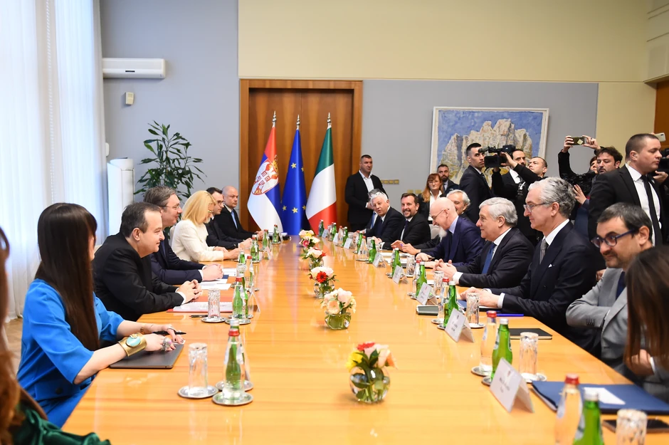 - Što se tiče infrastrukture, imamo dobru digitalnu infrastrukturu. Što se tiče putne, železničke infrastrukture, napredujemo, gradimo. Što se tiče odnosa, italijanske politike prema zapadnom Balkanu, ovde grade ogromne simpatije prema Italiji. Italijanski preduzetnici ovde mogu da se osećaju kao kod kuće. Kada sam bio u poseti severu Italije, video sam šta znače prave porodične kompanije, želeo bih da imamo takvih što je moguće više iz Italije. Znamo i da su vrata Italije za naše investitore otvorena. Gospodine Tajani, znamo da uvek razmišljate o bezbednosti Balkana.