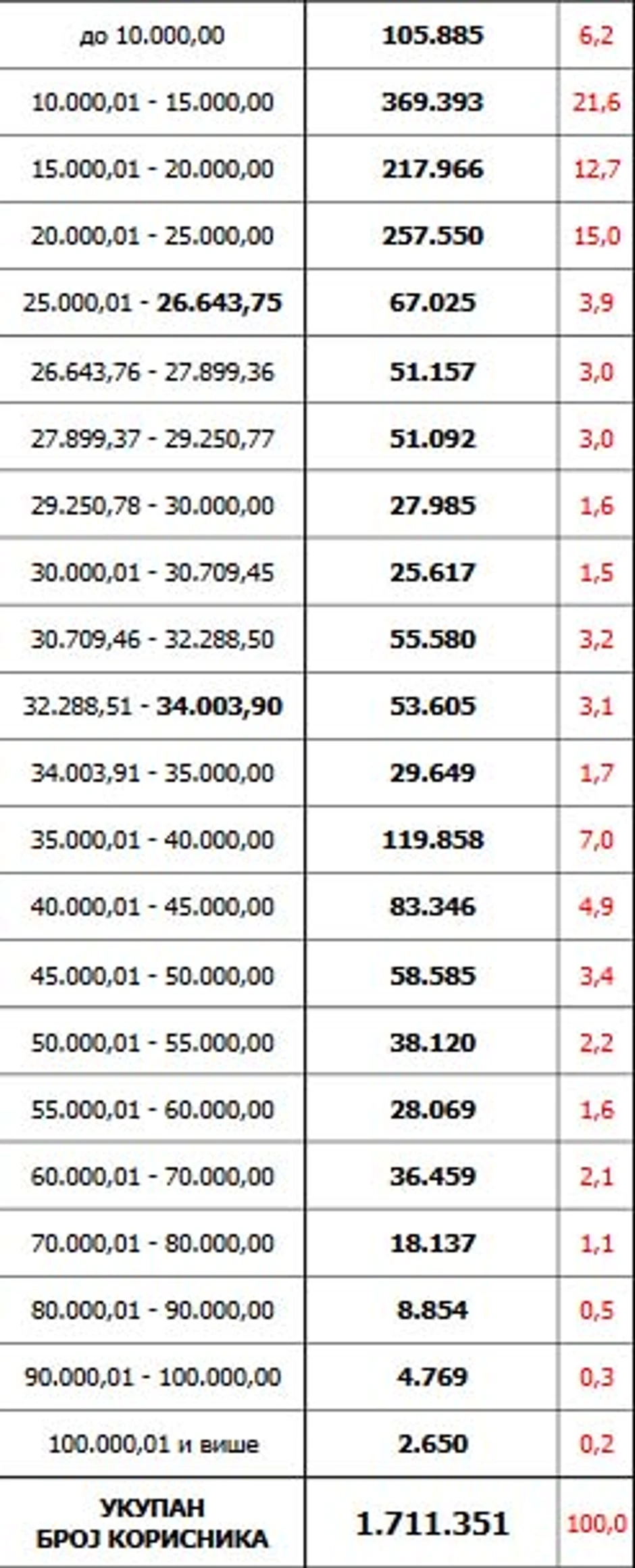 Detaljne podatke o visini penzija u dinarima, kao i realnom broju i procentu penzionera koje je primaju možete pogledati u nastavku.