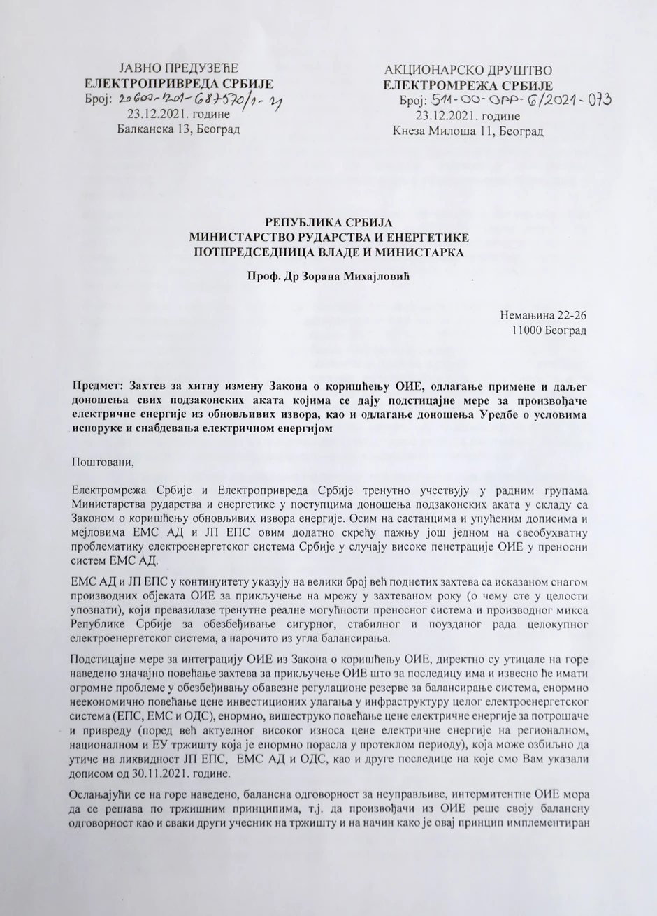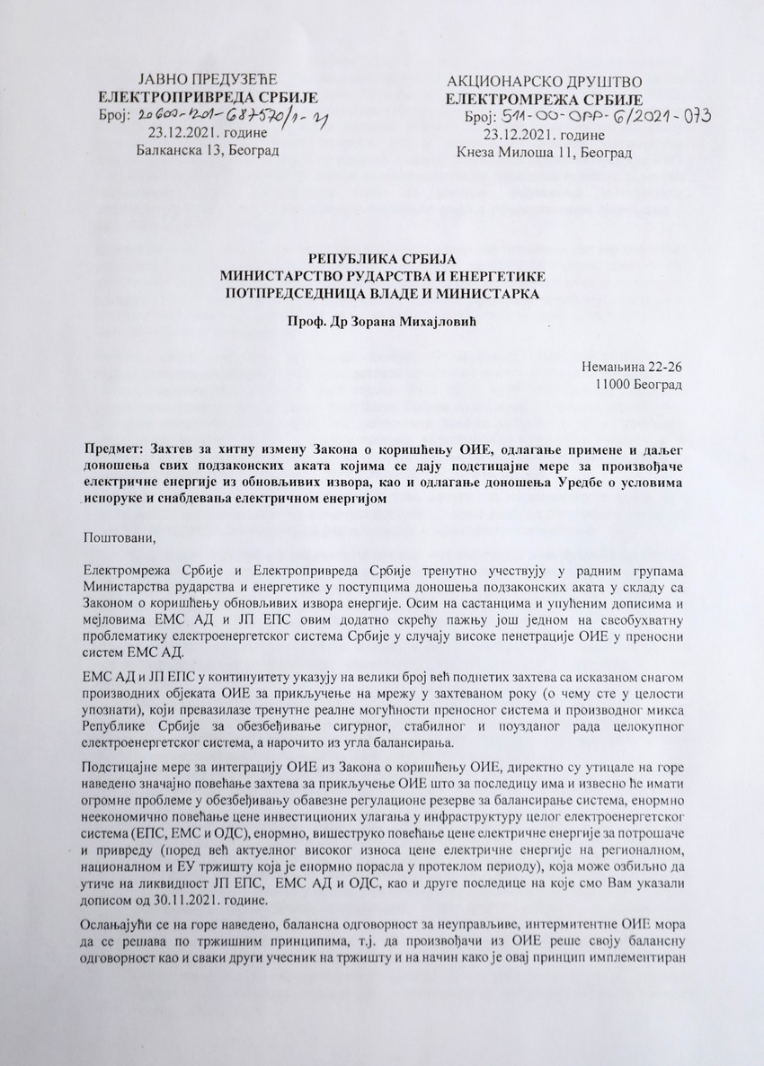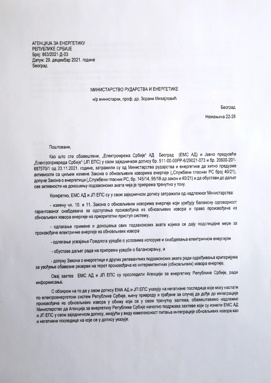 - Ovakva politika MRE može da dovede do ekstremnog (i do nekoliko puta) povećanja cene električne energije za potrošače i privredu Srbije ali i da ozbiljno ugrozi likvidnost EPS, EMS, ODS zbog enormnog povećanja investicionih ulaganja kako bi ispunili obavezne regulacione rezerve. Istovremeno treba ukinuti i premije i podsticaji za proizvođače energije iz obnovljivih izvora jer EPS sada bez naknade plaća balansiranje svih njihovih kapaciteta. Propisima je predviđeno da nastavi to da radi sve do uspostavljanja likvidnog unutardnevnog tršišta električne energije što bi ovu kompaniju zbog uvećanja kapaciteta iz OIE koštalo oko 400 miliona evra godišnje - stoji u dopisu upućenom MRE.