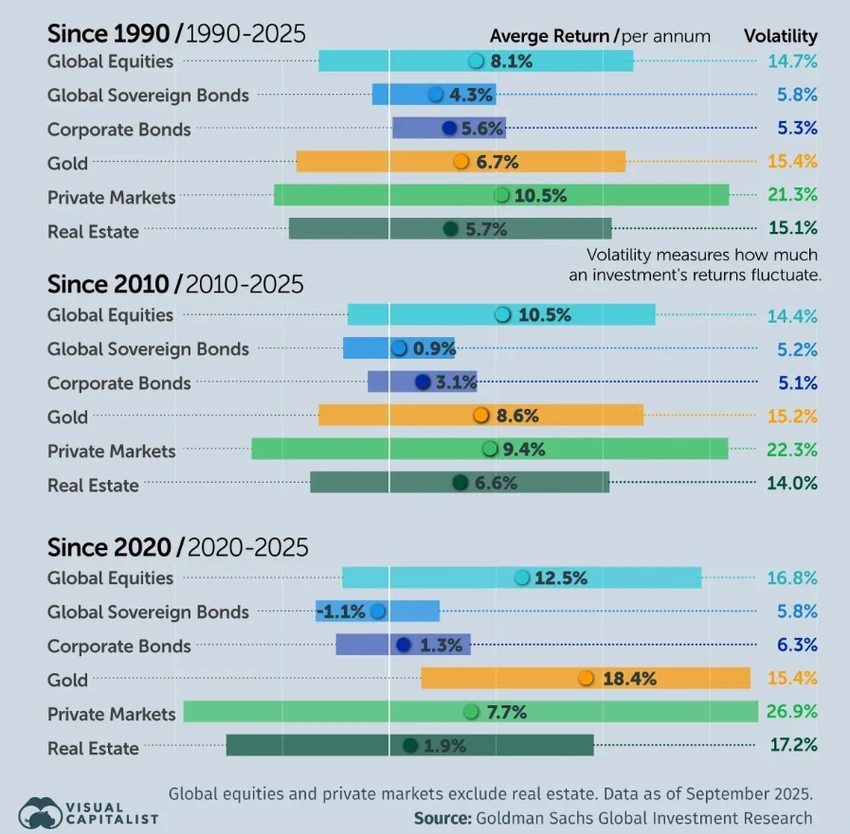Grafikon u nastavku prikazuje prosečne godišnje prinose i volatilnost po glavnim klasama imovine tokom tri različita perioda: dugoročni (1990–2025), srednjoročni (2010–2025) i najnoviji ciklus (2020–2025), koristeći podatke Goldman Saksa.