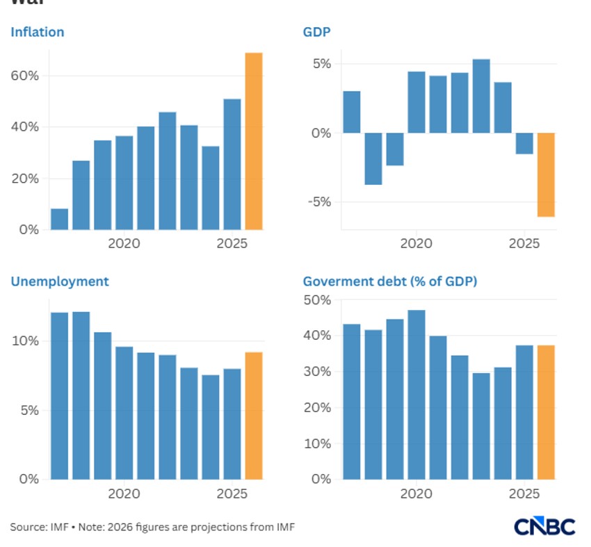 U svom "World Economic Outlook" izveštaju, Međunarodni monetarni fond procenio je da će se iranska ekonomija smanjiti za 6,1% u 2026. godini, uz inflaciju od 68,9%. Njena valuta je pala na oko 1,32 miliona rijala za jedan američki dolar.