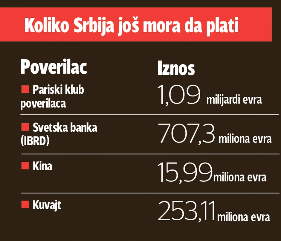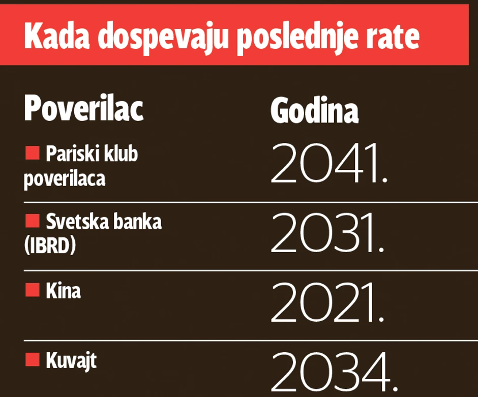 Ovom poveriocu dugujemo još tačno 1,09 milijardi evra, što znači da bi mu naredne 22 godine u proseku otplaćivali po 49,5 miliona evra. Navode i da ćemo narednih 12 godina morati da vraćamo i dugove prema Svetskoj banci, i to nešto više od 700 miliona evra. Poslednja rata za kredit uzet od Kine 1999. godine dospeva za dve godine, dok ćemo kredit koji su 1989. godine uzimali premijeri Milka Planinc i Branko Mikulić otplaćivati još punih 15 godina.