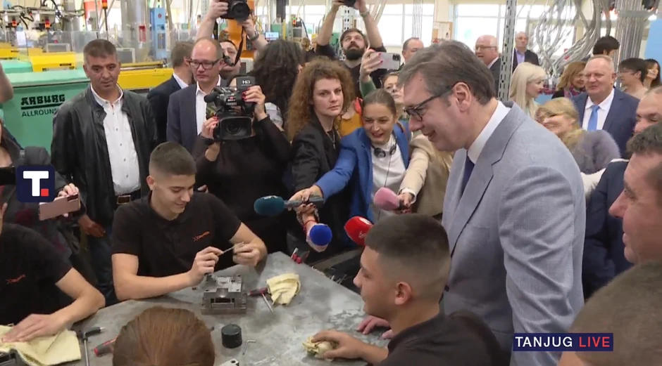 Predsednik se upoznao i sa učenicima koji su zaposleni u "Gruner" fabrici u sklopu sistema dualnog obrazovanja Tehničke škole u Vlasotincu, koji tu rade tri dana nedeljno.