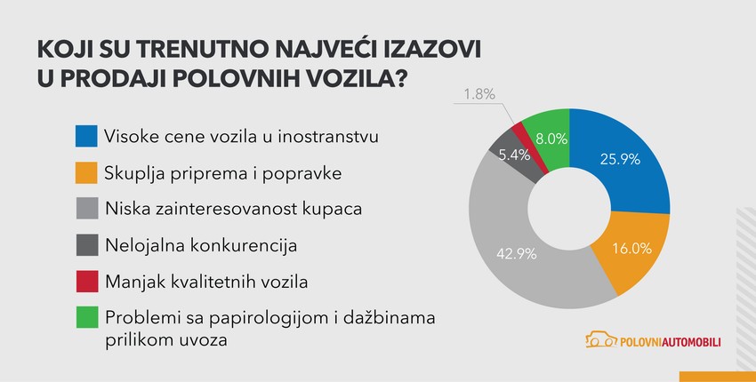 Naime, 26% učesnika ankete navelo je visoke cene vozila u inostranstvu kao najveći izazov u poslovanju, dok još 16% ispitanika kao glavni problem navodi skuplju pripremu vozila za prodaju. Sudeći po rezultatima ankete, može se zaključiti da je ponuda polovnih automobila veoma dobra, jer je manje od 2% ispitanika kao najveći izazov navelo manjak kvalitetnih vozila. Ipak, ono što pomalo iznenađuje jeste podatak da većina prodavaca misli da je najveći izazov za njihovo poslovanje zapravo niska zainteresovanost kupaca. Ovakav stav prodavaca polovnih automobila neočekivan je, jer je prodaja polovnih vozila iz uvoza u prvih šest meseci ove godine u porastu, možda i najvećem još od vremena pandemije.