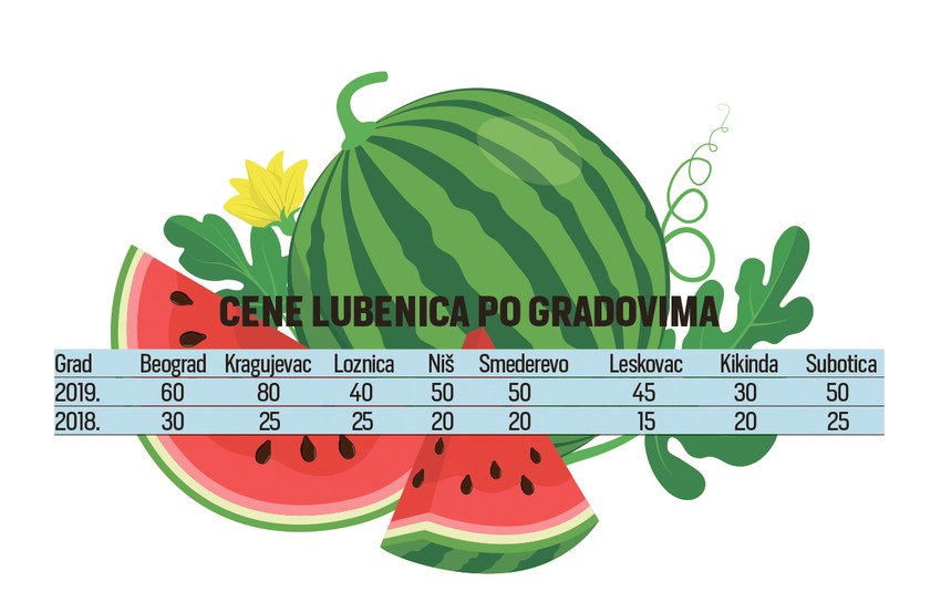 Velike količine padavina i grad uništili su u proseku oko 30 odsto roda, a cenu diktira i smanjen uvoz lubenica iz Grčke, Turske i Albanije jer se domaći marketi, čim stigne srpska roba, okreću domaćem bostanu zbog boljeg kvaliteta. Koliko je cena bostana skočila, govori i poređenje sa prošlogodišnjom u ovo vreme, koja je bila i po dva ili tri puta niža. Lubenice se sada prodaju od 50 do 80 dinara po kilogramu, dok su prošle godine bile od 15 do 40 dinara.