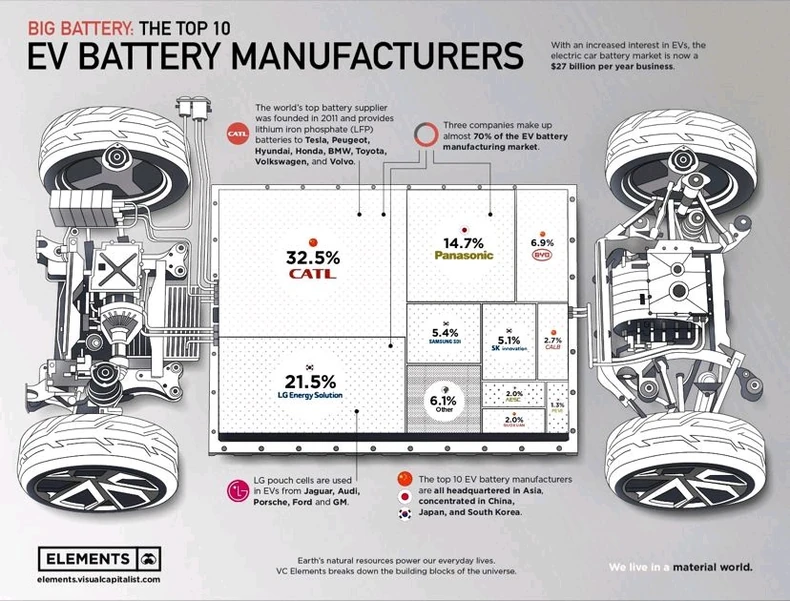 Najveći proizvođači baterija za električna vozila su iz Azije. Njih troje, kineski CATL (32,5 odsto), južnokorejski LG (21,5 odsto) i japansku Panasonic (14,7 odsto) drže više od dve trećine ukupne proizvodnje. Od 10 najvećih na svetu 4 su iz Kine i po 3 iz Južne Koreje i Japana, a svi drugi iz ostalih delova sveta imaju zajedno tek 6,1 odsto tržišnog udela, piše na svom LinkedIn profilu, Milan Horvat.