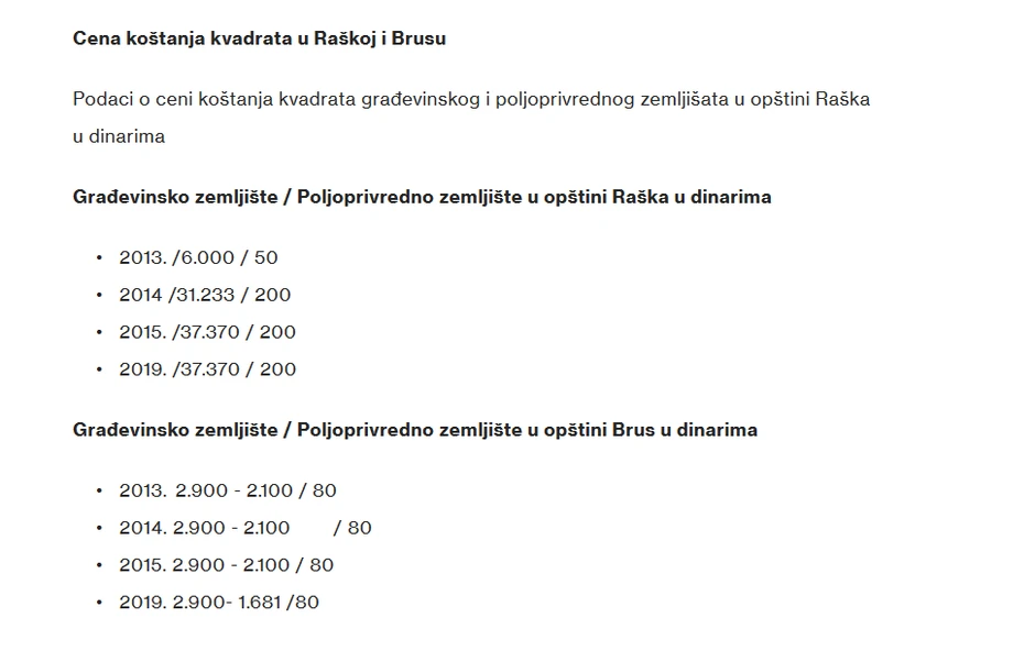 - Novac od prodaje i uređenja građevinskog zemljišta ne završava u opštinskoj kasi već se sliva u džepove nekolicine lokalnih moćnika koji od njega prave privatne hacijende i kupuju stanove i vile na tuđa imena od nelegalno stečenih para, a ne kanalizacionu i vodovodnu mrežu. Nelegalna gradnja cveta a pred njom se zatvaraju oči jer se to debelo plaća. Nerealno je da niko ne vidi šta se dešava u Raškoj tim pre što na bruskoj strani je sve to urađeno iako se u njihov budžet mnogo manje para sliva. Tamo se cena kvadrata godinama nije menjala pa iznosi 2.900 dinara po kvadratu u ekstra zoni dok je u ostalim zonama čak i pala sa 2.100 na 1680 dinara - navodi se u pismo koje je upućeno “Blicu”.
