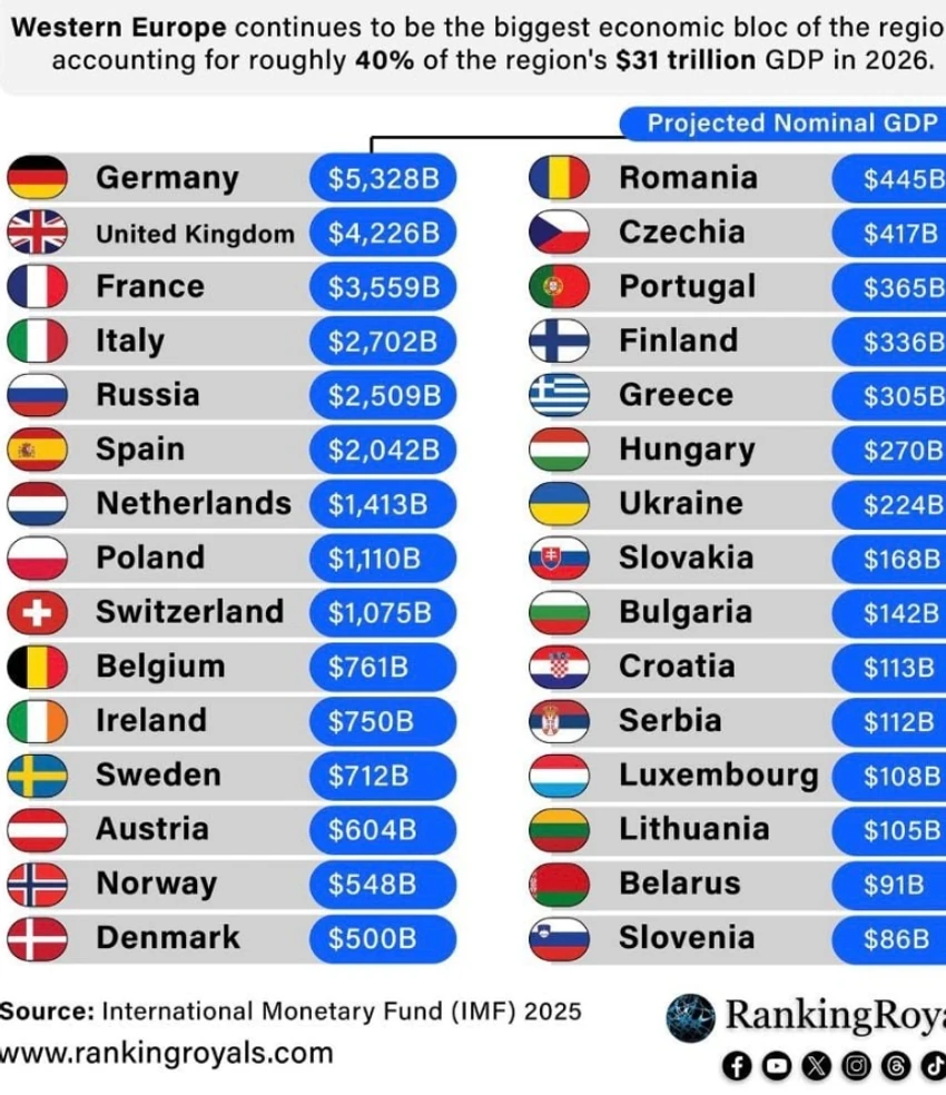 Podaci MMF-a pokazuju da Zapadna Evropa i dalje čini oko 40% ukupnog evropskog BDP-a, ali promene unutar kontinenta postaju sve vidljivije.