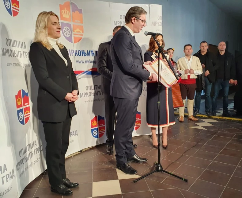 Predsednik Srbije Aleksandar Vučić istakao je da je posebno ponosan što stoji pred građanima Mrkonjić Grada i zahvalio se još jednom Miloradu Dodiku, što je uprkos porodičnoj tragediji došao da bude domaćin, i da pokaže jedinstvo naroda.