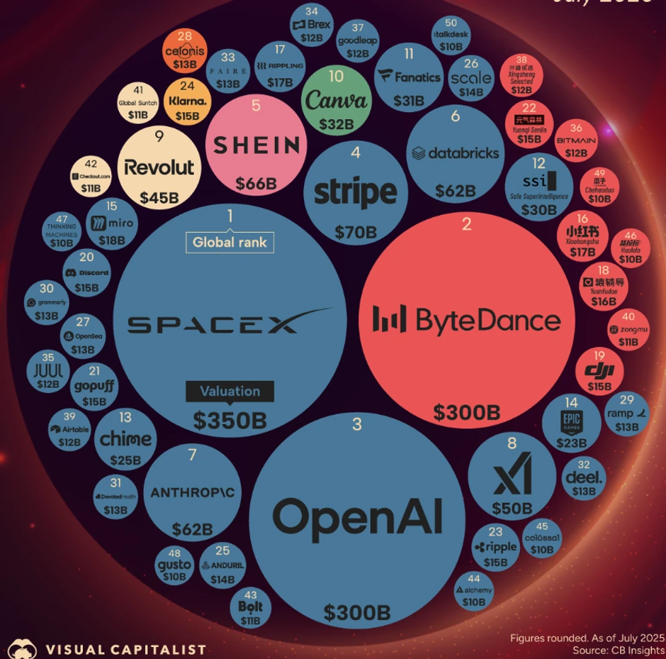 Infografika u nastavku rangira 50 najvrednijih privatnih kompanija na svetu u 2025. godini, ističući nove sile iz različitih zemalja i sektora.