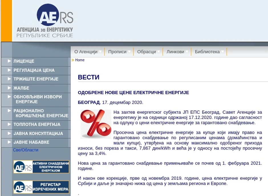 Nova cena za garantovano snabdevanje primenjivaće se počev od 1. februara 2021. godine.