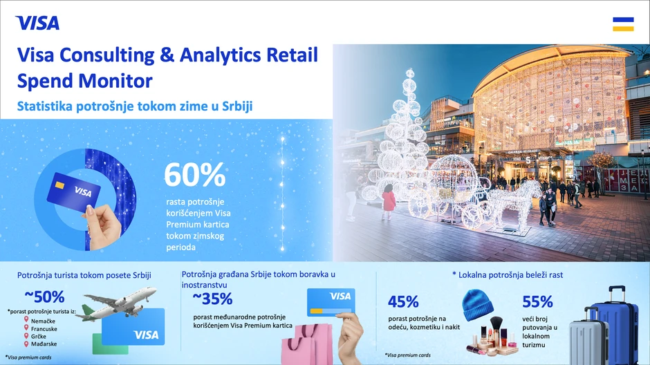 Visa, globalni lider u digitalnim plaćanjima, objavila je najnovije podatke o potrošačkim navikama tokom zimskog prazničnog perioda 2025. godine u Srbiji, na osnovu podataka Visa Consulting & Analytics Retail Spend Monitora. Istraživanje pokazuje da je potrošnja korišćenjem Visa premium kartica tokom zime porasla za 60 odsto u odnosu na prethodnu godinu, što ukazuje na veći broj putovanja i obilaska Srbije, a i veću potrošnju u ugostiteljstvu i segmentu zabave.