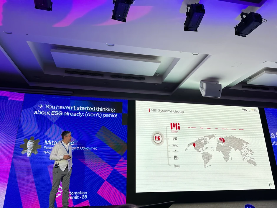 Upravo ta pitanja izazvala su veliko interesovanje na Automation Summit-u u Splitu prošle nedelje, gde je Mita Stojić, direktor kompanije TIAC koja je članica M&I Systems grupe, održao predavanje pod nazivom „Još niste počeli da razmišljate o ESG-u? (Ne) paničite!“. Kroz svoje izlaganje, Stojić je osvetlio ključne tehničke i poslovne izazove s kojima se kompanije susreću prilikom uvođenja ESG rešenja, kao i konkretna softverska rešenja koja mogu da unaprede poslovanje i omoguće efikasno sprovođenje ESG principa poslovanja.