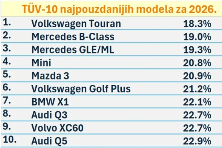 Lista 10 najpouzdanijih modela automobila za 2026. godinu