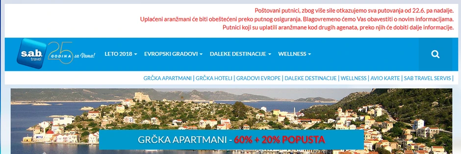 Ranije danas iz Asocijacije turističkih agencija saopšteno je da agencija "S.A.B." prestaje sa prodajom aranžmana, a nekoliko sati kasnije je i na sajtu agencije istaknuta ista poruka.