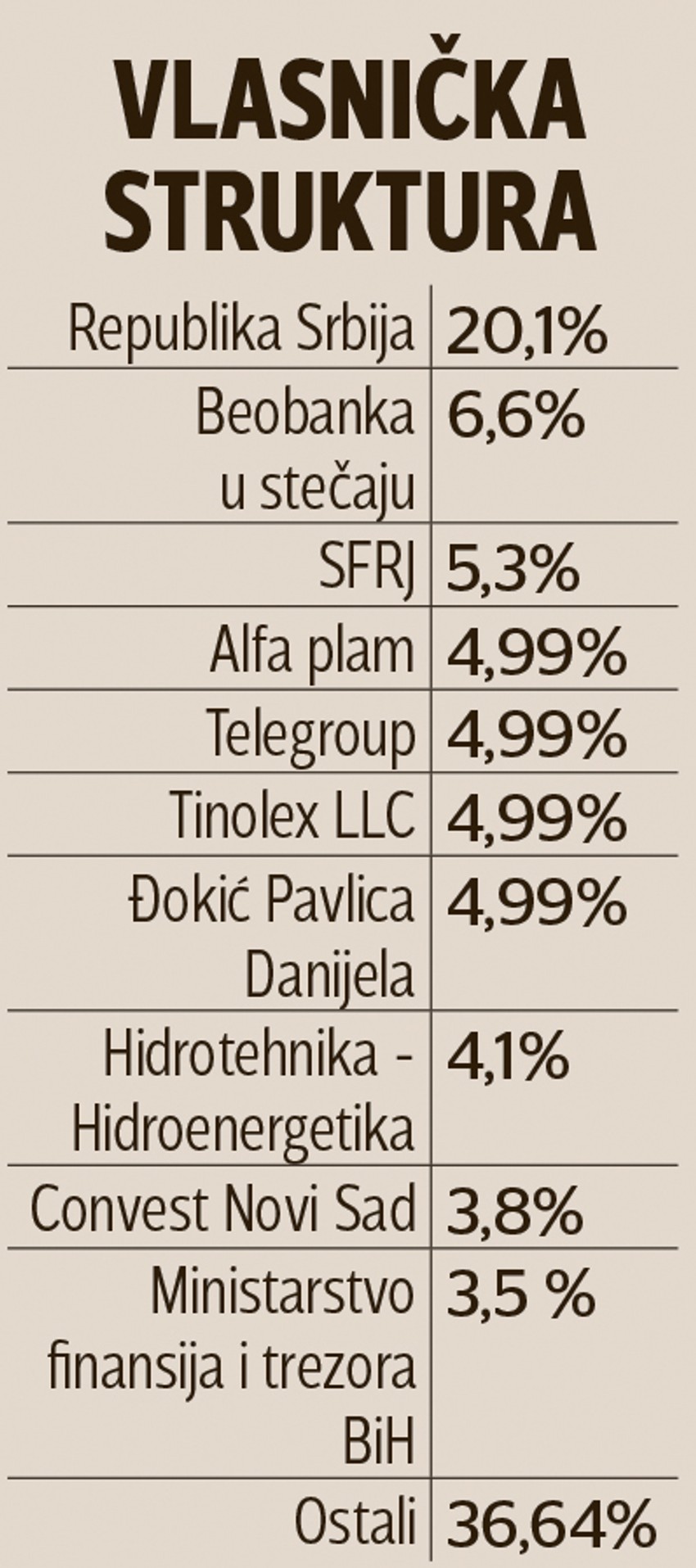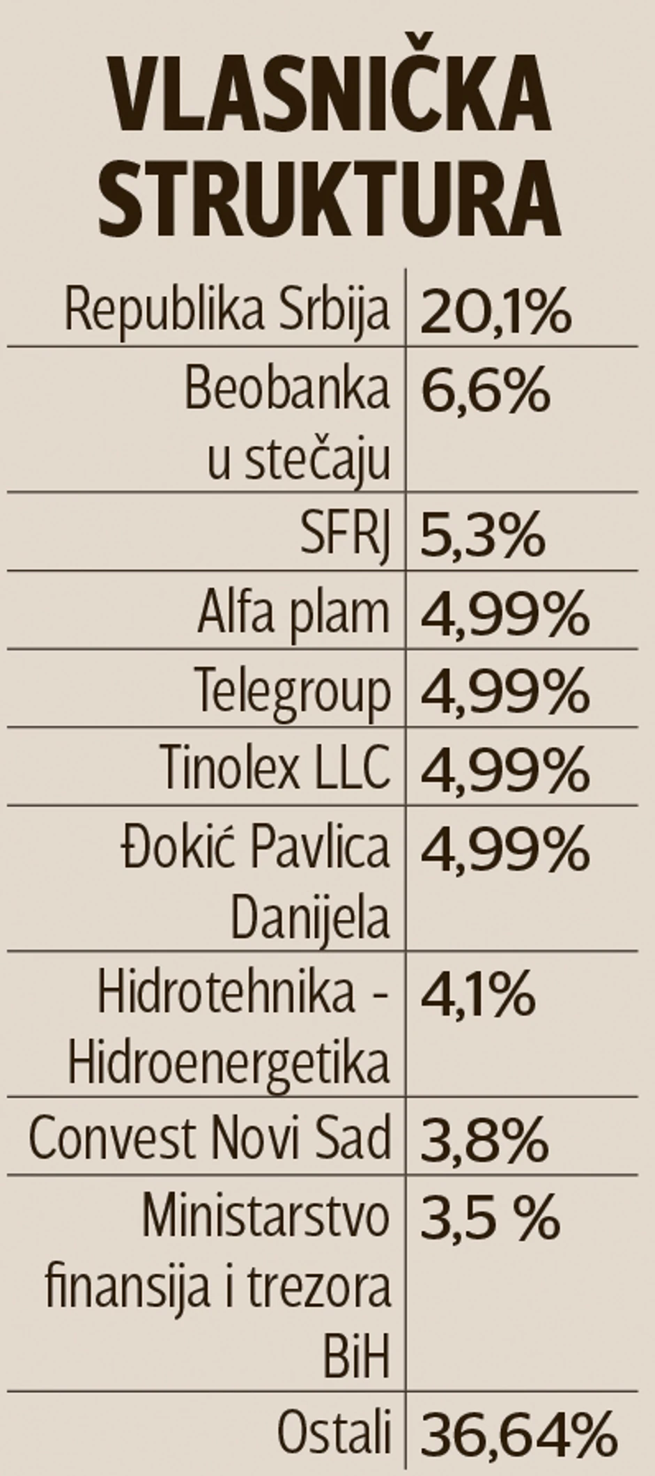 Pored države, kao najznačajnijeg akcionara, drugi najveći akcionar u Jubmes banci je Beobanka u stečaju sa udelom od 6,6 odsto, dok je na trećem mestu SFRJ sa 5,33 odsto akcija koje nisu podeljene nakon raspada Jugoslavije. Jedan od značajnih akcionara, na četvrtom mestu po udelu, jeste kompanija "Alfa plam" sa udelom od 4,99 odsto, a koja je u vlasništvu uspešnog srpskog biznismena Miroljuba Aleksića. On se već oprobao u bankarskim vodama, 1996. godine je osnovao Alko banku, koju je 2007. prodao belgijskoj KBC banci. U međuvremenu je kupovao i osnovao dvadesetak uspešnih kompanija poput hotela "Izvor" u Aranđelovcu, "Pionira" u Subotici, "Hisara"...