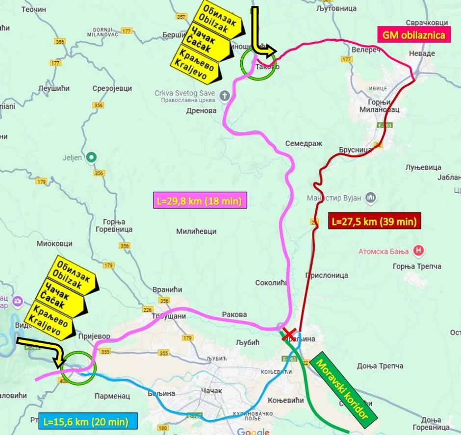 Tokom zatvaranja denivelisane raskrsnice „Preljina“ saobraćaj će se, ka odredištima Čačak i Kraljevo, odvijati na sledeći način: