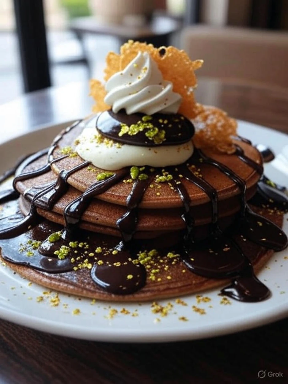 Palačinke su od tradicionalnog testa sa puterom, ali obogaćene ukusima Dubai čokolade, uključujući pistaće, lešnik i kataifi (fino rendano lisnato testo). Prelivene su luksuznim dodacima kao što su velika čokoladna tabla, šlag sa Madagaskar vanilom i zlatne listiće od 24-karatnog jestivog zlata, čija je vrednost oko 3.000 dolara po unci.