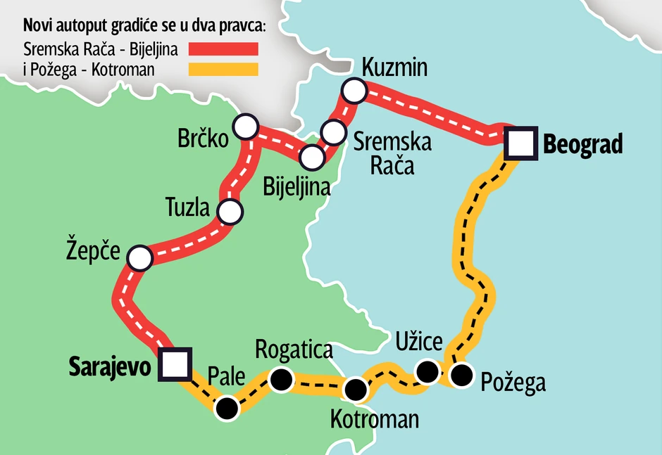 Autoput Beograd-Sarajevo gradiće se kao prsten, u dva pravca: Kuzmin - Sremska Rača (granica sa BiH) - Bijeljina i Požega - Kotroman (granica sa BiH). Deonica Sremska Rača – Kuzmin ima dužinu od oko 18 kilometara, a trasa Požega-Užice-Kotroman je dugačka oko 60 kilometara.
