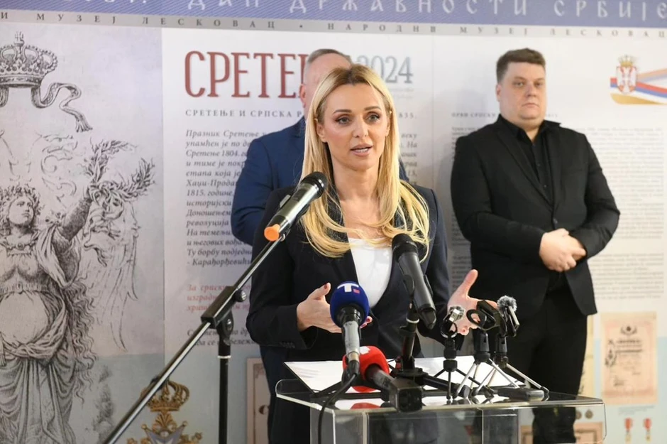 Ministarka poljoprivrede, šumarstva i vodoprivrede Jelena Tanasković danas je u Leskovcu otvorila izložbu ”Sretenje 2024 - odlikovanja dinastije Obrenović i Karađorđević” u Narodnom muzeju u Leskovcu.