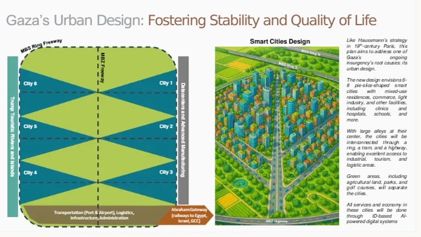 Sa podnaslovom „Od propalog iranskog posrednika do prosperitetnog abrahamskog saveznika“, ovaj veoma ambiciozni plan sastavili su ljudi koji izgleda nemaju fizičko znanje o Gazi, bliskoistočnoj politici ili stvarnim problemima koji mogu nastati pretvaranjem teritorije u turistički i tehnološki centar vredan milijardu dolara koji bi neizbežno konkurisao Izraelu. Istovremeno, ne bi mu bilo potrebno američko finansiranje, već bi to uradili razni investitori sa 100 milijardi dolara. Kako je planirano, lučki grad bi bio izgrađen podeljen plovnim putem i okružen sa do osam zelenih, visokotehnoloških megagradova pokretanih veštačkom inteligencijom, očigledno po uzoru na projekat Saudi Neo. Planiran je i proizvodni centar Ilona Maska na ruševinama industrijske zone Erez.